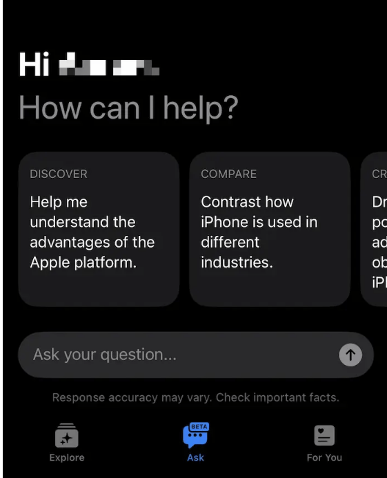 除了内部培训用的 Asa 外,苹果近期也在 Apple支持 App 中针对少数用户开放了全新 AI 助理「Support Assistant」,并且进行限定用户初步测试。